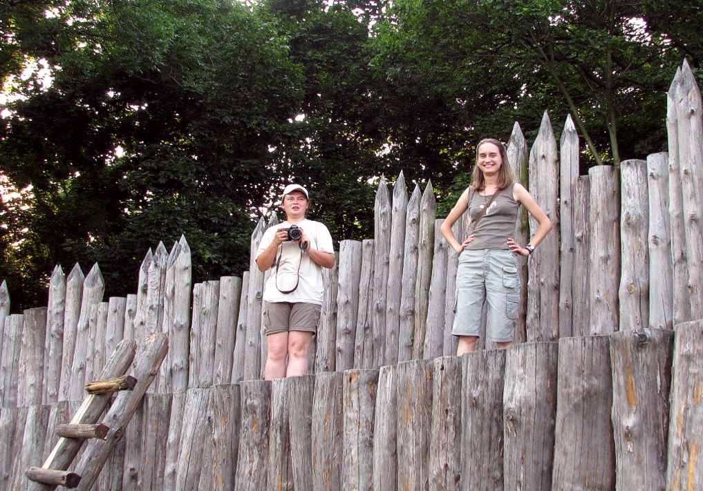 Agnieszka Henel i Julia Dobrzańska zwiedzają grodzisko w Lądzie.