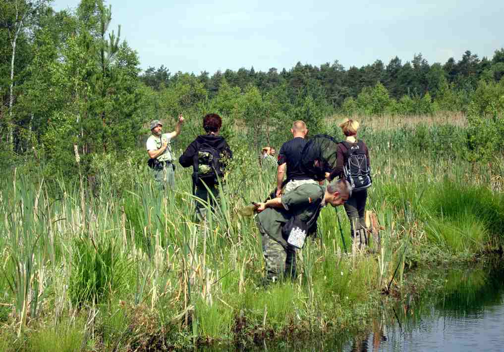 24 czerwca w piątek po śniadaniu wyruszyliśmy w teren. Nasze wycieczki odbywały sie na terenie Parku Krajobrazowego Lasy nad Górną Liswartą. Na pierwszy dzień przewidziana była trasa nad użytek ekologiczny Brzoza. Tu łowiliśmy ważki na stawie Stara Brzoza i położonym za nim bagnie. Widzieliśmy tam kilkanaście gatunków w tym Nehalennia speciosa, wprawdzie mało licznie występująca, ale niektórzy z nas mieli okazję zobaczyć ją po raz pierwszy. Ja wykonałam zdjęcia „paszportowe” Somatochlora flavomaculata i tym samym uznałam jeden z celów za osiągnięty. Później obejrzeliśmy las różaneczników katawbijskich w miejscu, w którym była ich szkółka założona przez hrabiego Ludwika Karola von Ballestrema. Nastepnie obserwowaliśmy ważki nad zbiornikiem Nowa Brzoza. |