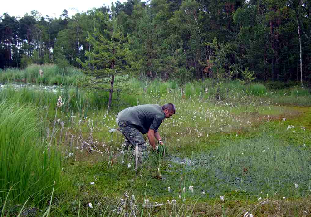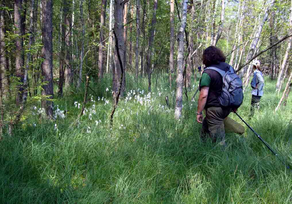 Po obiedzie sesja referatowa: 26 czerwca w niedzielę, ostatniego już niestety dnia Sympozjum, pojechaliśmy rano do użytku ekologicznego Bagno w Jeziorze, gdzie widzieliśmy wokół zbiornika wodnego bardzo zróżnicowaną roślinność. Jeden z brzegów porośnięty jest mszarem dywanowym, po którym da się chodzić, lecz czuje się wyraźnie, że jest to tylko pływający, miękki kożuch, który łatwo rozerwać. Poruszaliśmy się po specjalnie do tego celu sporządzonych pomostach, aby nie deptać mchów torfowców Sphagnum sp., żurawiny Oxycoccus palustris i rosiczek Drosera rotundifolia. Obok tych roślin występują też wełnianka wąskolistna Eriophorum angustifolium i turzyce Carex sp. Na brzegu pomiędzy sosnami i brzozami rośnie obficie bagno zwyczajne Ledum palustre. Dolinkę niewielkiego cieku wypełnia całkowicie czermień błotna Calla palustris. Po drugiej stronie zbiornika woda jest zapewne płytsza, bo tworzy się szuwar trzcinowy Phragmites australis. | |||